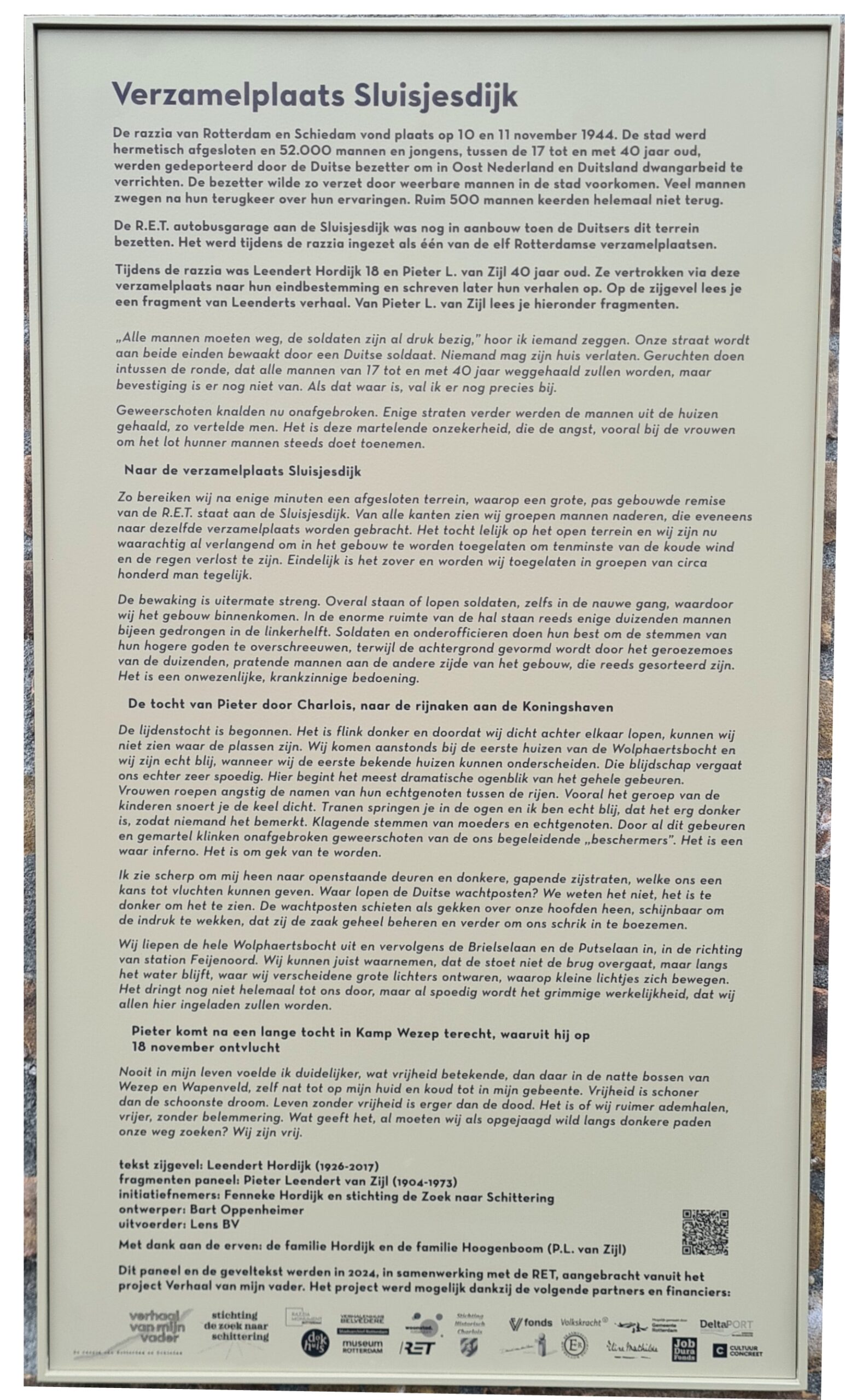 Carolien Hoogenboom vertelt over het bijzondere verhaal van haar oudoom, Pieter Leendert van Zijl, die tijdens de razzia van november 1944 werd opgepakt en via de Sluisjesdijk in Rotterdam naar Kamp Wezep werd gedeporteerd. Toen haar ouders overleden en zij het huis opruimde, vond Carolien een dikke map met zijn handgeschreven manuscript. Ze was diep onder de indruk van de persoonlijke beschrijvingen en typte alles over, zodat haar familie het kon lezen. Via de Historische Vereniging Schiedam kwam ze in contact met onderzoekers van de Razzia 1944, die het manuscript als waardevol bronmateriaal herkenden. Fragmenten daaruit zijn inmiddels vereeuwigd op een herdenkingspaneel bij de Sluisjesdijk.