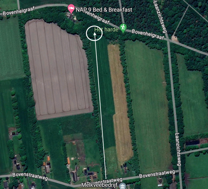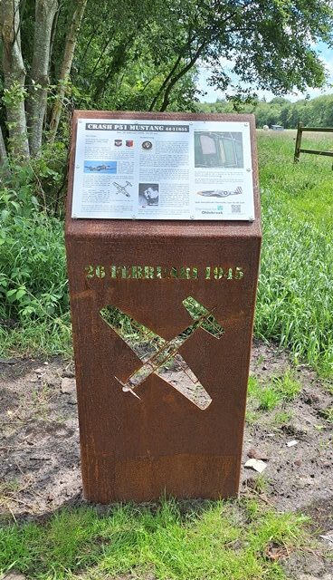 Bij het tweede perceel vanaf de Laanzichtsweg, nabij huisnummer 90, staat het informatiebord voor de gecrashte Mustang. De crashplek is rechts van de heg op ongeveer 450 m afstand.