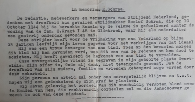 In 1944 hielp Roelof met de verspreiding van “Strijdend Nederland” die in Elburg werd gedrukt.